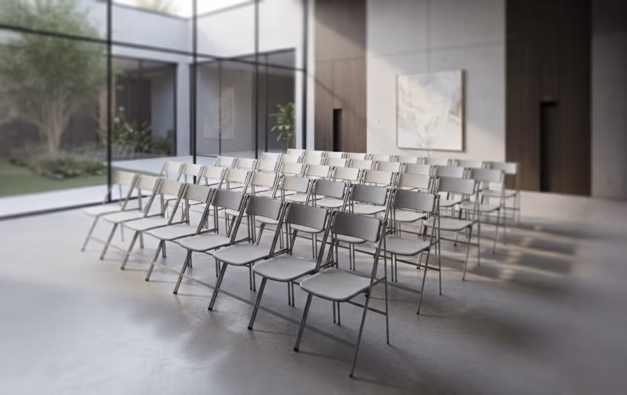 Pour Sinotec, spécialiste du mobilier événementiel à destination des collectivités, PAD a conçu une chaise pliante professionnelle pensée pour les environnements à forte rotation : salles de congrès, mairies, hôtels, centres culturels et espaces polyvalents.